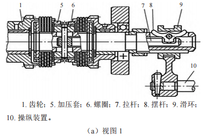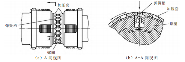 當(dāng)摩擦離合器出現(xiàn)故障時(shí),先應(yīng)用螺絲刀壓下彈簧銷(xiāo)(見(jiàn)圖 2),再旋轉(zhuǎn)加壓套,使其繞著螺圈做小幅度位移,實(shí)現(xiàn)兩個(gè)摩擦片之間的間隙變化,進(jìn)而調(diào)整摩擦片間的壓緊力和傳遞轉(zhuǎn)矩。位置調(diào)節(jié)好后,將彈簧銷(xiāo)從加壓套的任何一個(gè)凹槽中頂出,以免在轉(zhuǎn)動(dòng)過(guò)程中出現(xiàn)加壓套松動(dòng)的問(wèn)題。