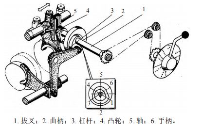 主軸變速器操縱機(jī)構(gòu)主軸箱中共有7個(gè)齒輪滑塊,其中 5 個(gè)用于改變主軸的轉(zhuǎn)速。這些滑塊的移動(dòng)由操縱機(jī)構(gòu)來(lái)完成 [3]。圖 4 為軸Ⅱ、軸Ⅲ上滑移齒輪操縱機(jī)構(gòu)示意,主要用來(lái)控制軸Ⅱ的雙聯(lián)齒輪左、右兩個(gè)嚙合位置。軸Ⅲ上的三聯(lián)齒輪滑塊有左、中、右 3 個(gè)位置,通過(guò)不同位置的組合可使軸得到 6 種不同的轉(zhuǎn)速。